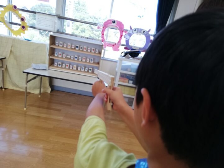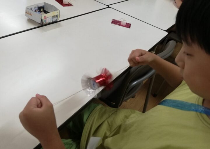 ⑦おもちゃ屋さん  きらきらブンブンゴマをつくって遊びました。回ると羽が開いてキレイだったね。