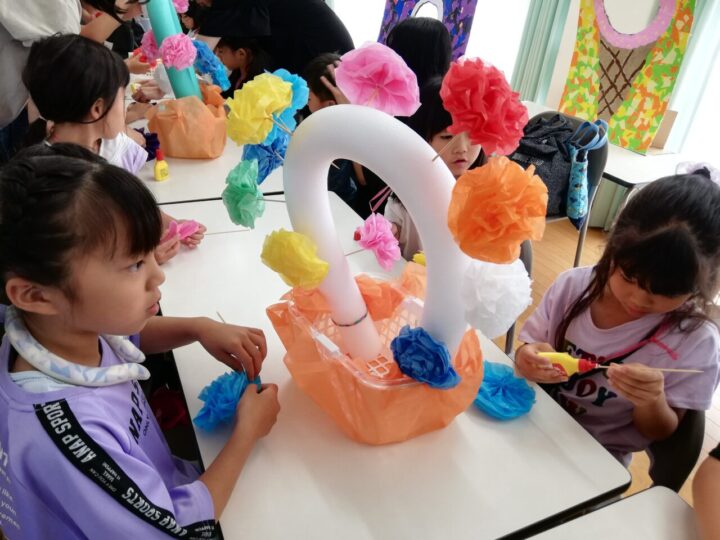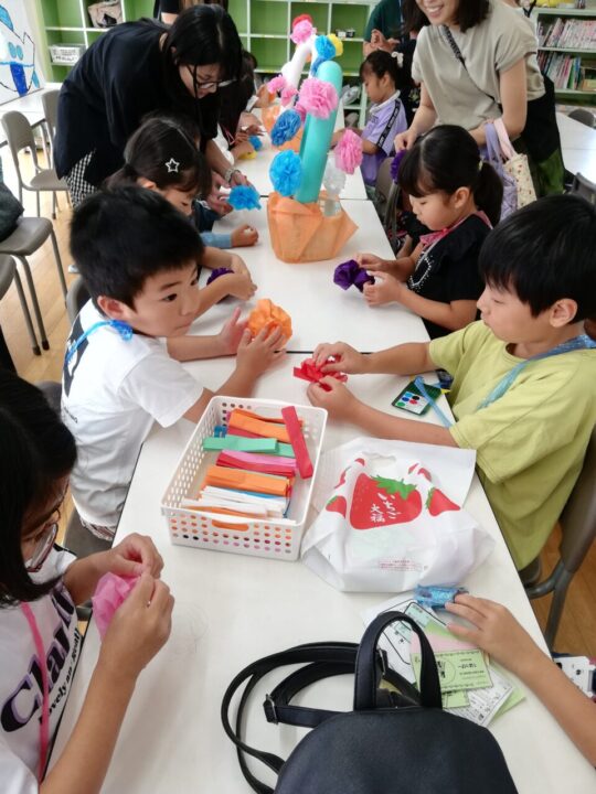 ⑥お花屋さん  花を作って児童館をかざろう。色とりどりのお花をみんなで作りました。