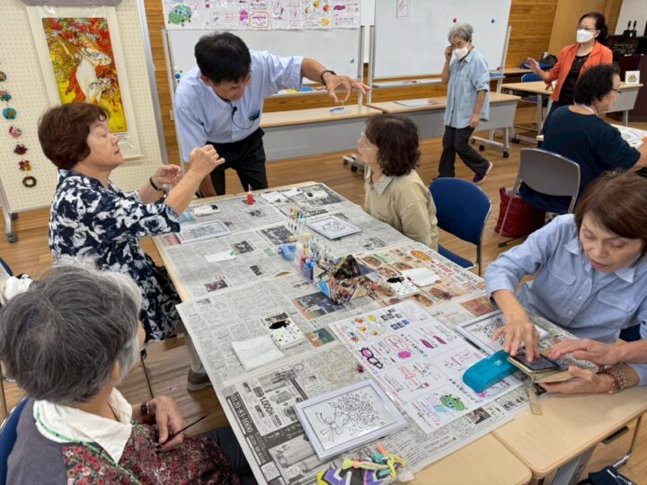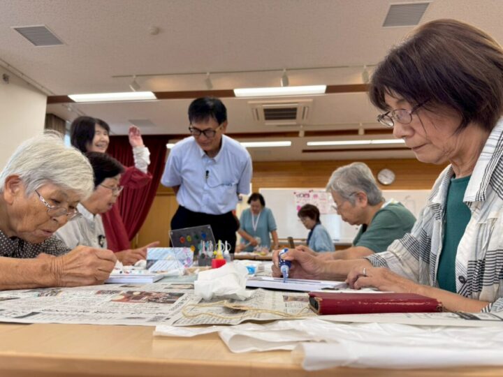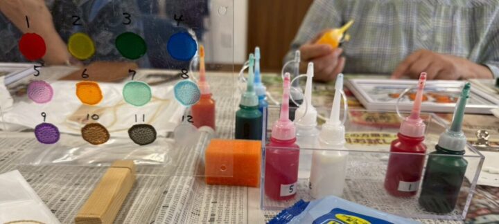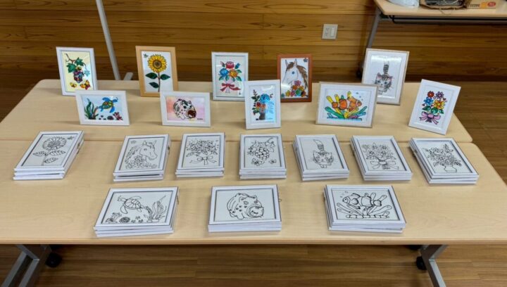 車のフロントガラスの廃材からできた特殊な絵の具を使い、先生にご用意いただいた下絵に好みの色を塗り、光にかざすとステンドグラス調に輝く透明感のある作品に仕上がりました。最初は不安を感じる参加者もいましたが、完成した自分だけのオリジナルアート作品に、皆さん満足感を味わっていました。