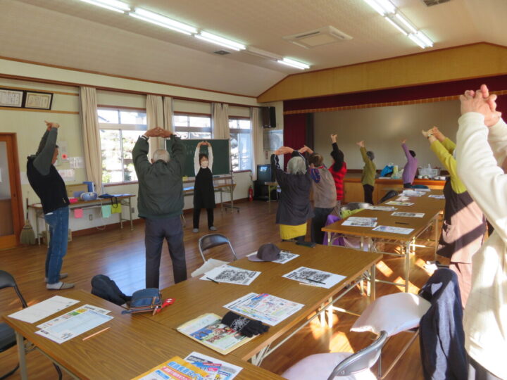 学びの後は、ストレッチ体操で体をほぐし、新春恒例の抹茶が振る舞われる茶話会へ。配布された脳トレ問題に挑戦しながら、和やかな談笑を楽しみました。最後は全員で輪になり、早口言葉やゲームを通じて地域の絆を深めました。